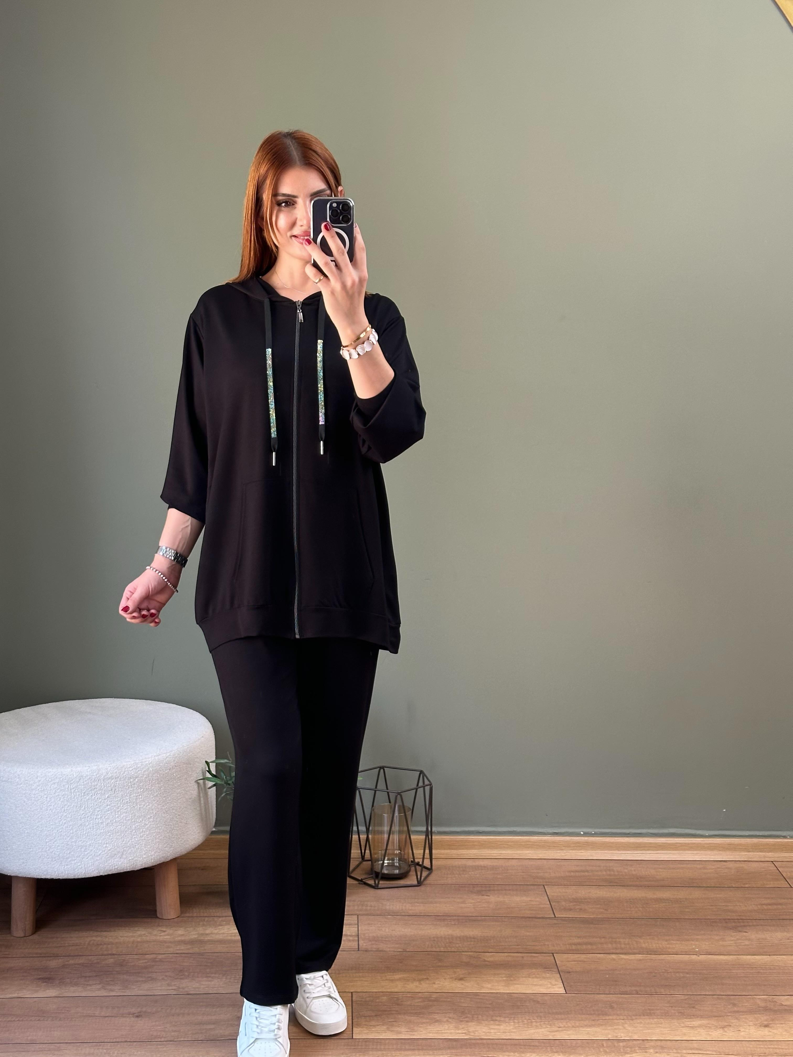 %100 ORGANİK PAMUK KAPÜŞON İPİ TAŞ İŞLEMELİ İKİLİ TAKIM SİYAH
