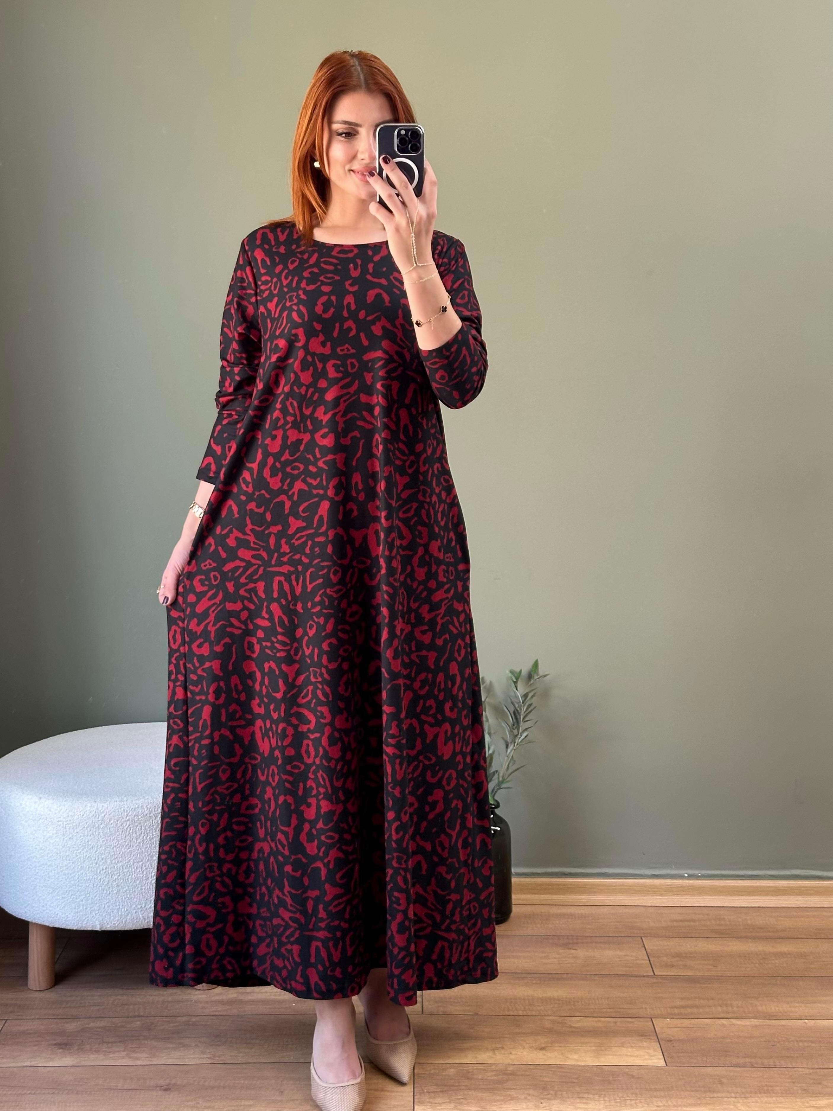 A kesim ince suet kumaş elbise bordo benek desen (D813)