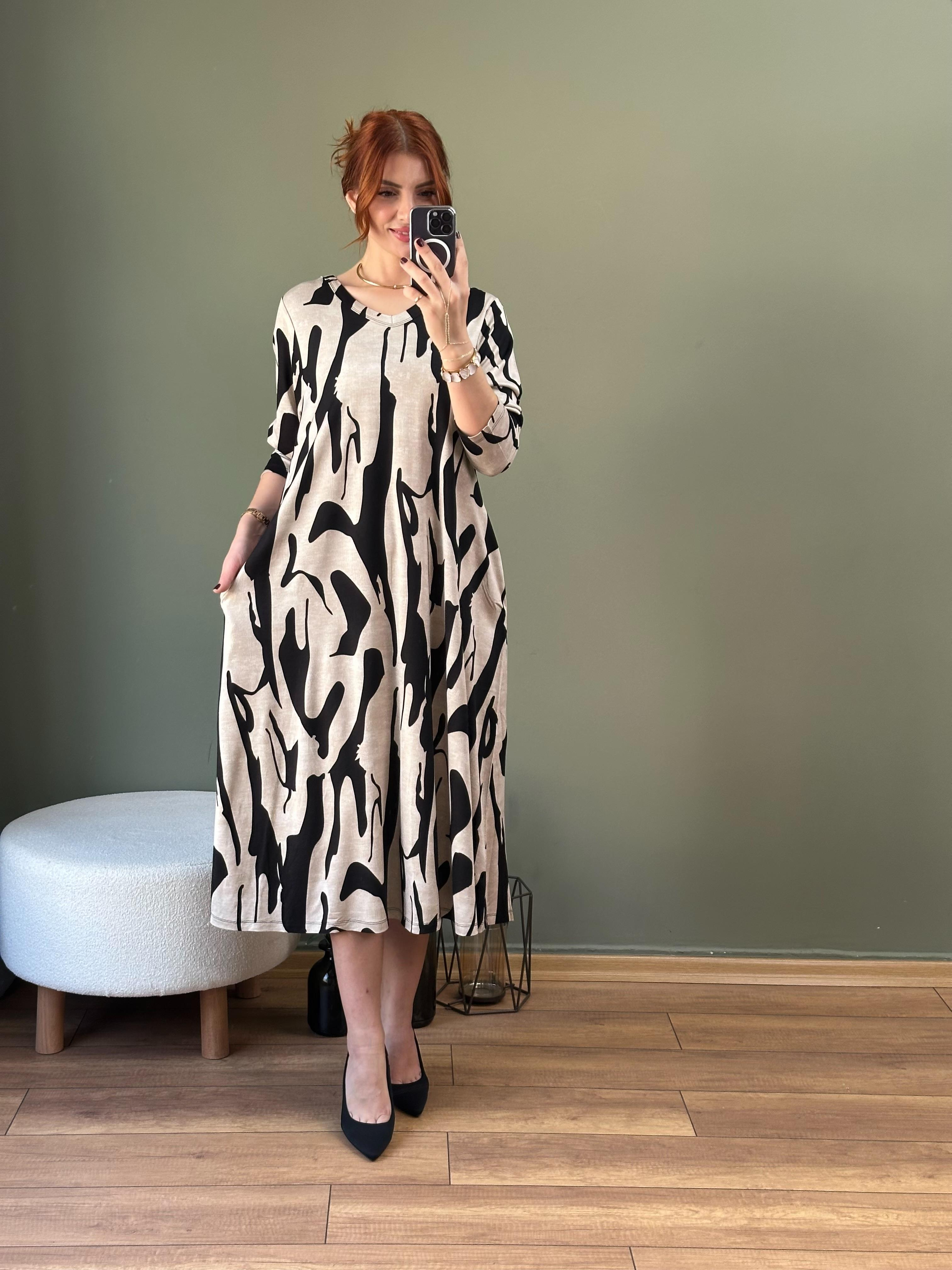 A KESİM V YAKA MIDI BOY ELBİSE SİYAH BEYAZ DESEN (D810)