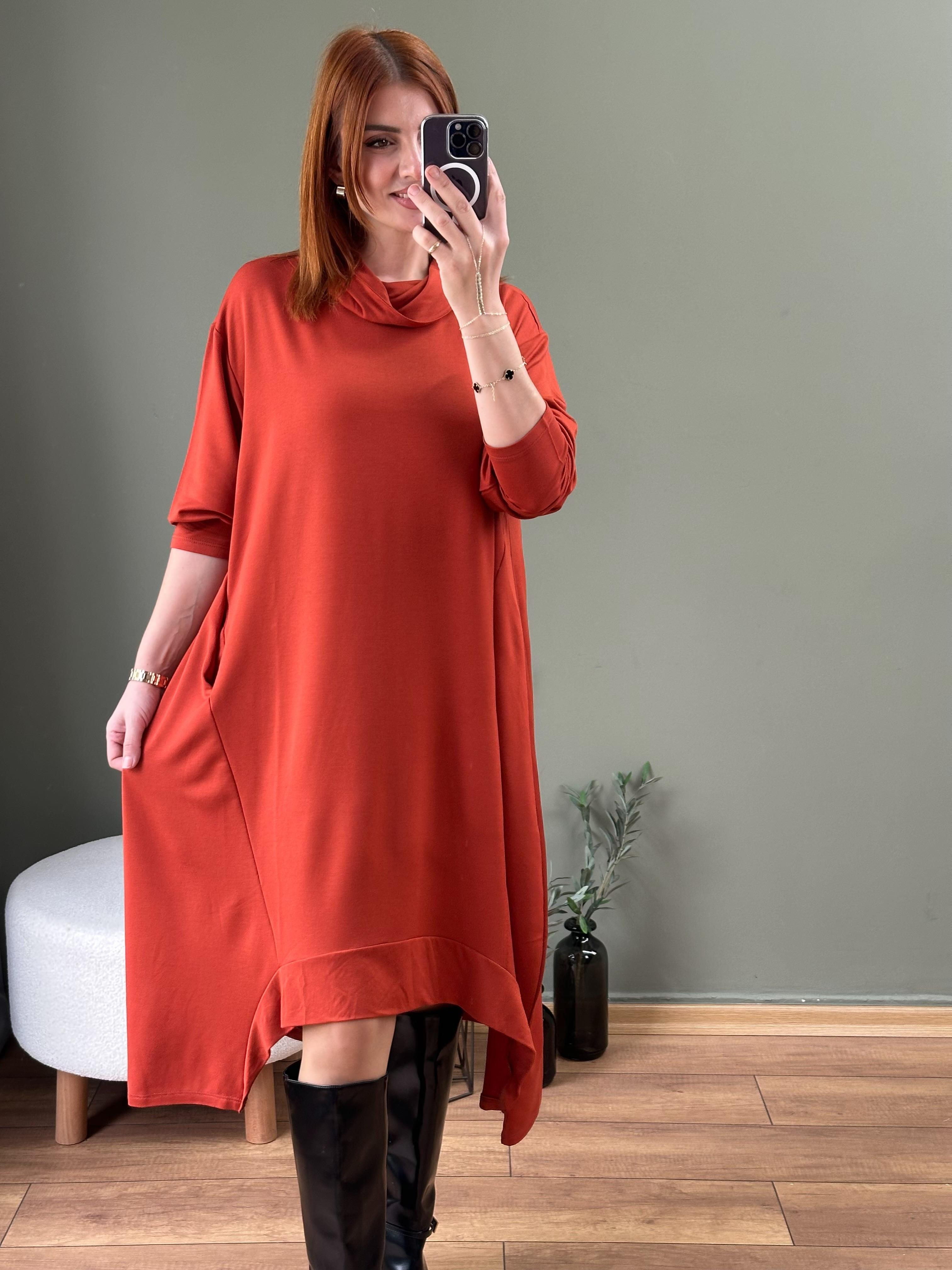 DEGAJE YAKA ASİMETRİK KESİM TUNİK KİREMİT (D826)