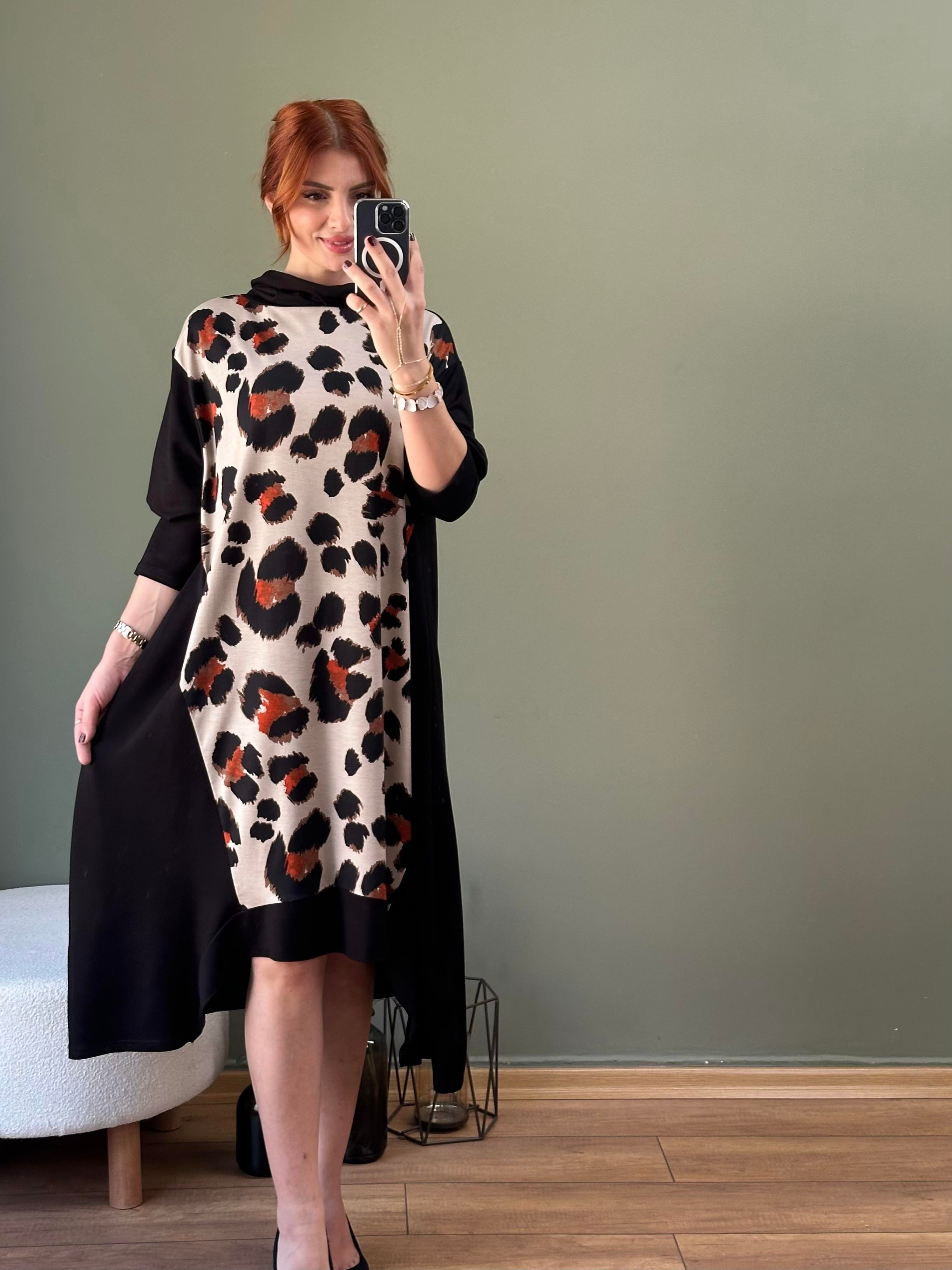 DEGAJE YAKA ASİMETRİK KESİM TUNİK LEOPAR DESEN (D825)