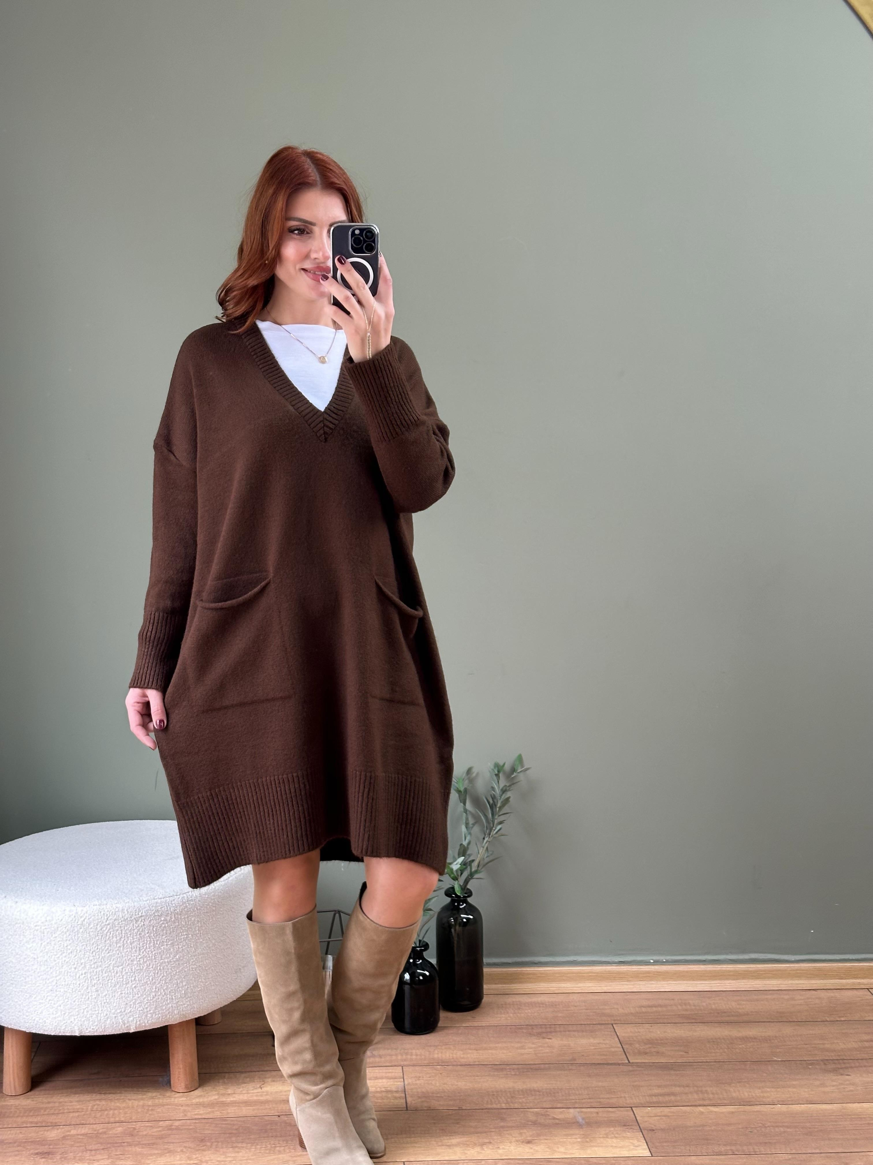 V yaka tişört detaylı tunik kazak acı kahve (D848)